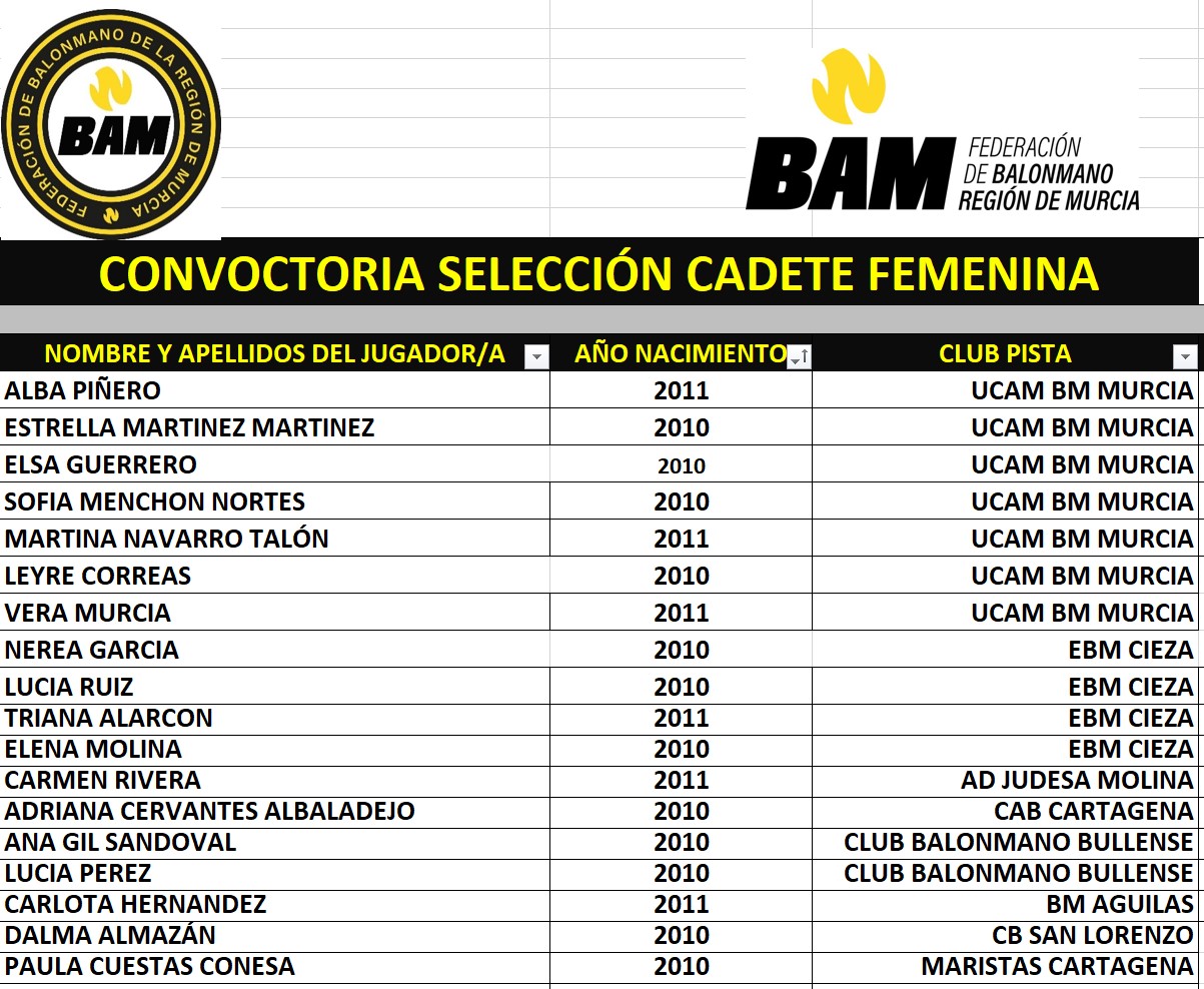 CONVOCATORIA CERRADA CADETE FEMENINA (Si no estás en el listado significa que no sigues adelante, sólo podrán asistir a este entrenamiento las convocadas)