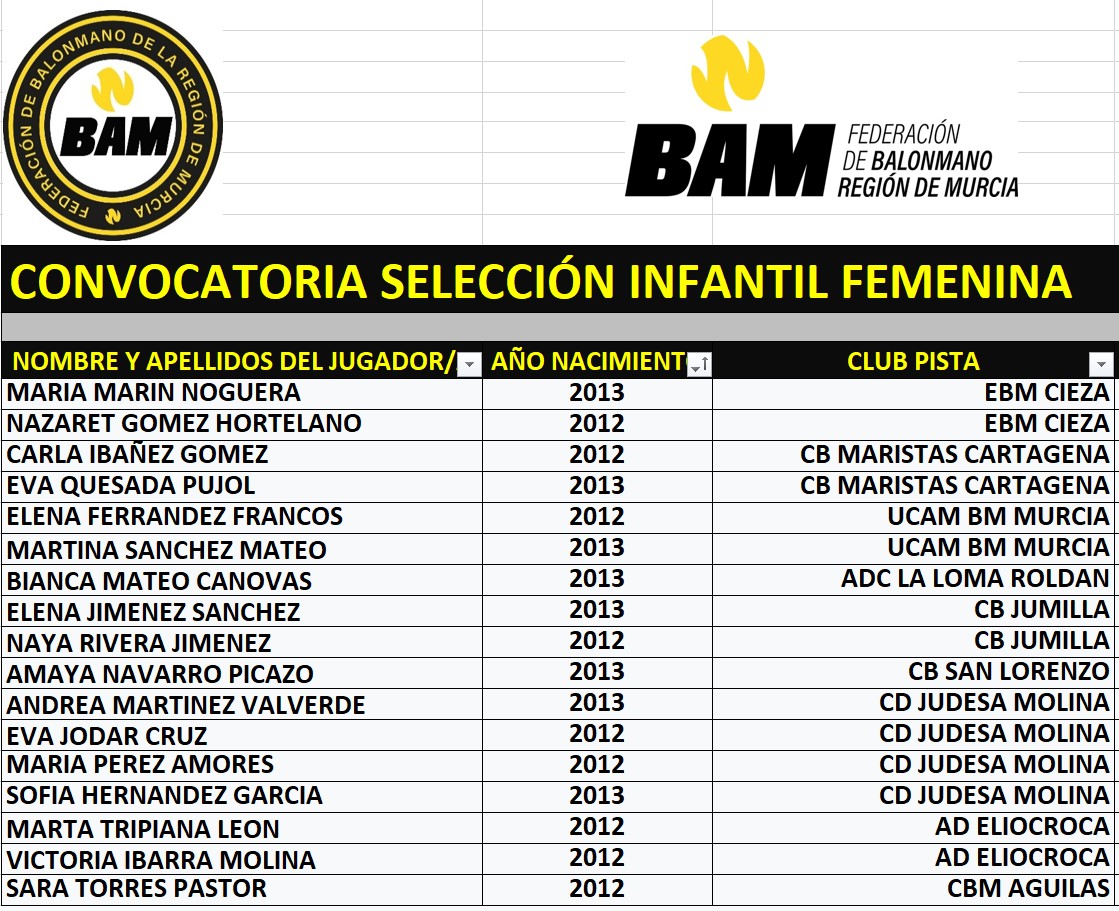 CONVOCATORIA CERRADA INFANTIL FEMENINA (Si no estás en el listado significa que no sigues adelante, sólo podrán asistir a este entrenamiento las convocadas)