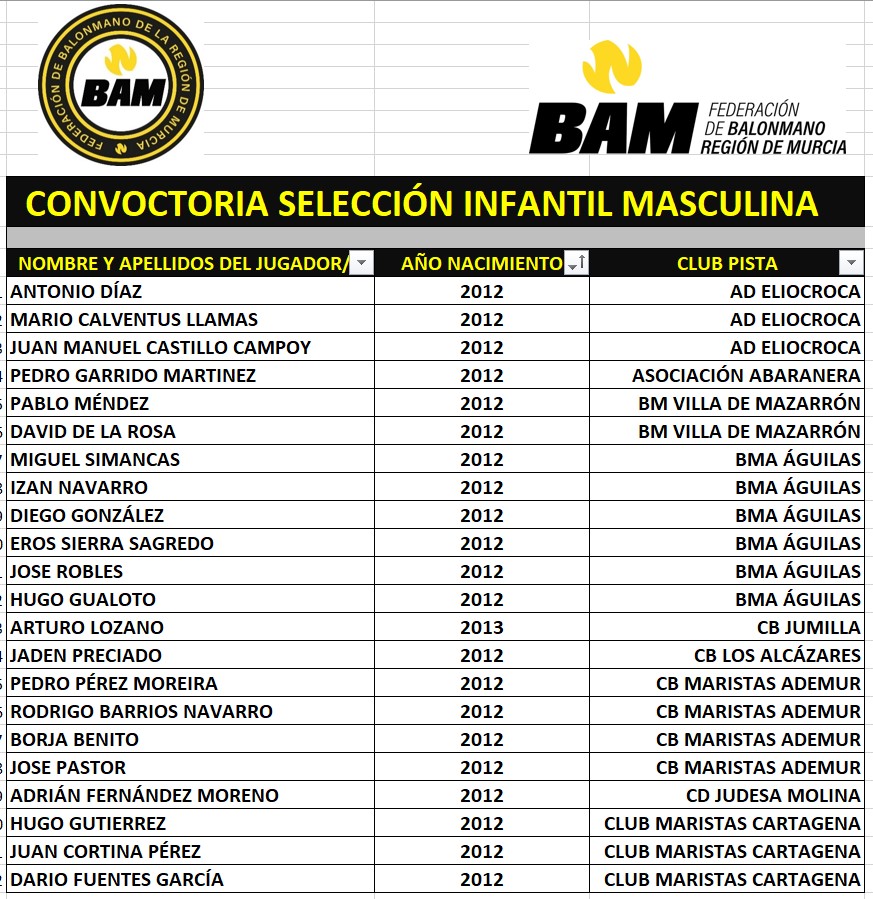 CONVOCATORIA CERRADA INFANTIL MASCULINA (Si no estás en el listado significa que no sigues adelante, sólo podrán asistir a este entrenamiento los convocados)