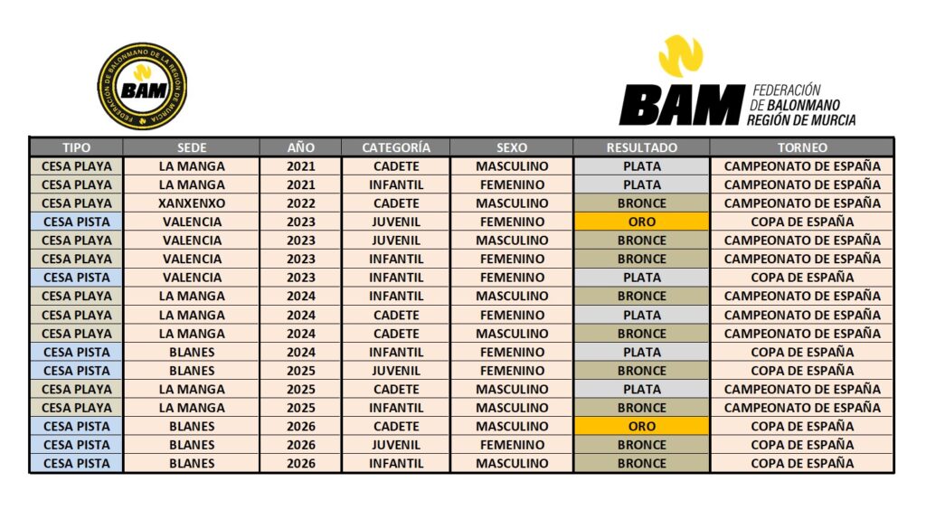 Durante el periodo comprendido entre 2021 y 2026, la Federación de Balonmano de la Región de Murcia (BAM) ha obtenido un total de 17 medallas en los distintos Campeonatos y Copas de España, tanto en modalidad de balonmano playa como balonmano pista. Estos resultados reflejan una evolución constante y una destacada presencia en competiciones nacionales, con representación en todas las categorías —infantil, cadete y juvenil— y en ambos sexos.